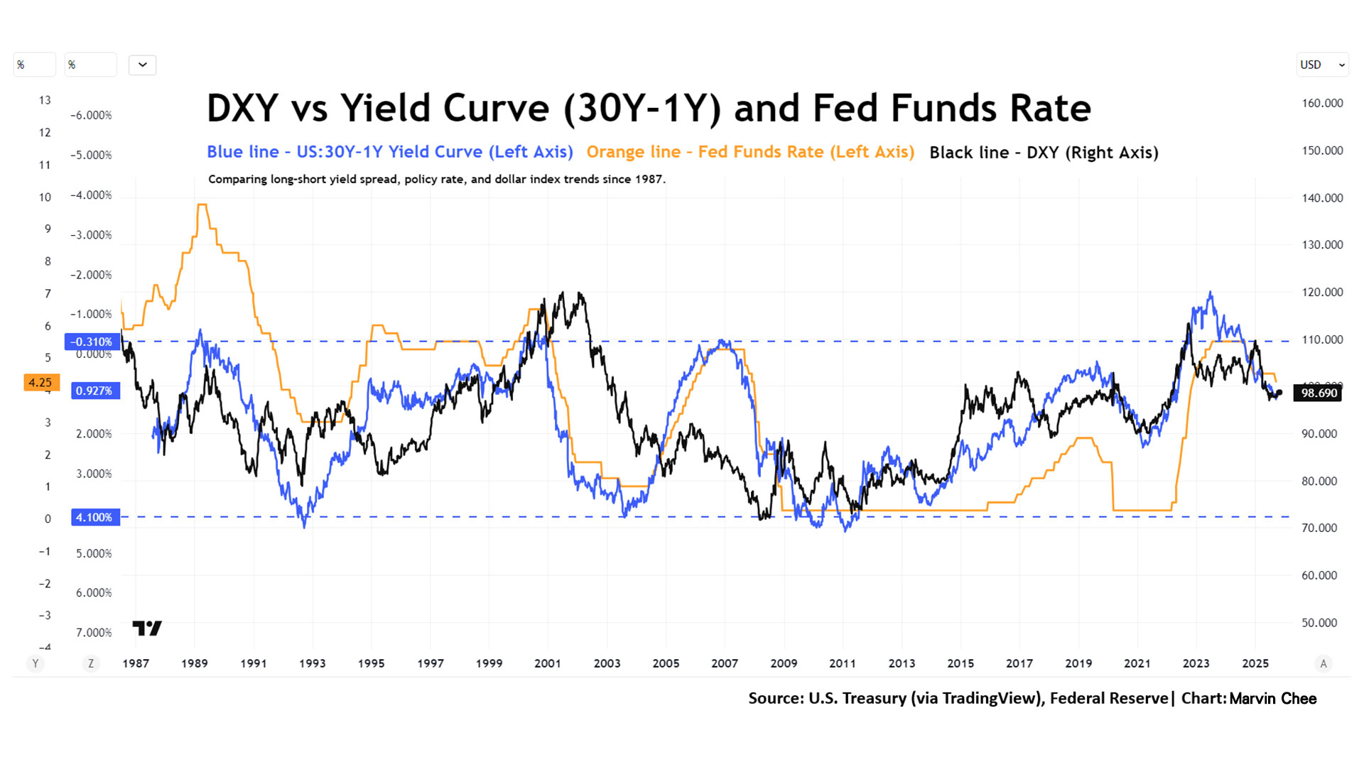 這時候或有人會問:為何不直接觀察聯儲局制定的聯邦基金利率(Fed Funds Rate)?其實這確是一個常見做法,也能大致解釋美元的走勢。不過,其細緻度不及(30Y–1Y)孳息曲線。從圖表可見,藍色線(30Y–1Y)相較於橙色線(Fed Funds Rate),更能貼近黑色線(DXY)的走勢(見圖 4)。需留意,圖中(30Y–1Y)曲線的刻度為倒轉顯示:上方為負值,下方為正值,旨在方便與美元指數走勢作比較。