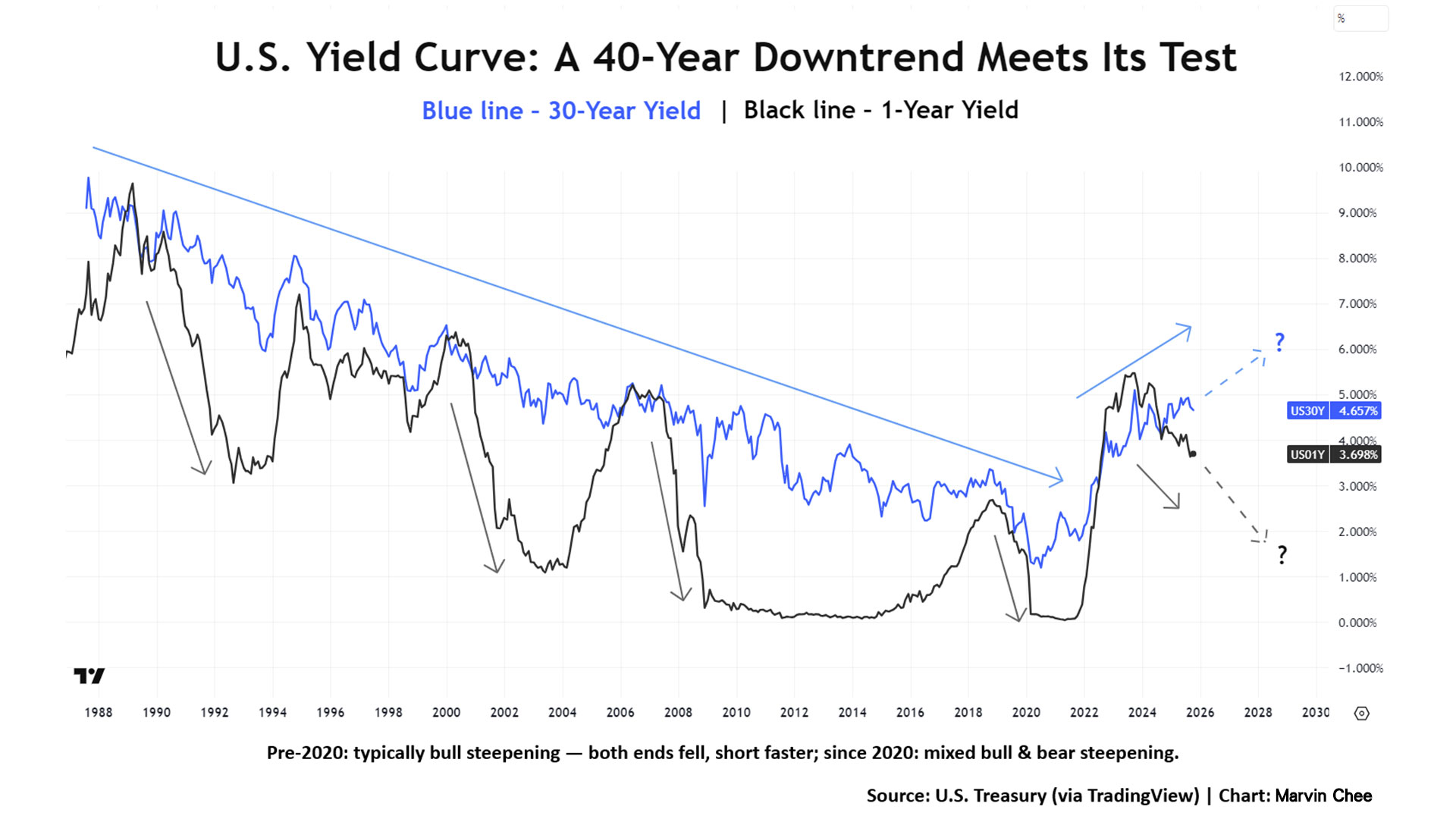 在低通脹環境下,30年期孳息率(藍線)過去數十年呈持續下降趨勢,而更受政策利率影響的1年期孳息率(黑線)多數時間維持在30年期以下。每當減息周期出現,短端利率往往跌得更快,兩者息差擴闊,孳息曲線隨之陡峭化。當長短息同時下跌時,意味債價上升,即屬牛市走勢。從圖中可見,2020年前以牛市陡峭化為主導;但2020年後情況出現變化——1年期孳息隨減息下跌,30年期卻持續上升,牛熊並存,屬罕見的現象。