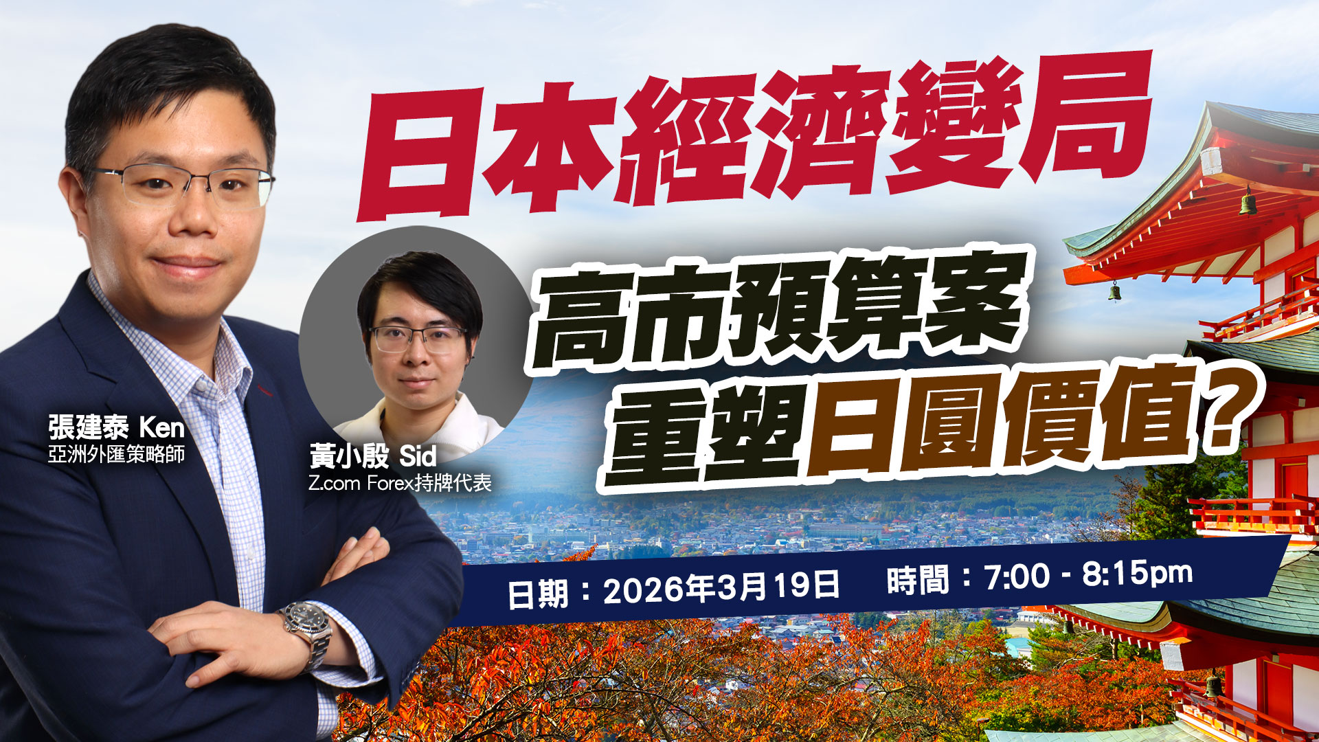 | 講者: | 張建泰 Ken - 亞洲外匯策略師 黃小殷 Sid - Z.com Forex持牌代表 |